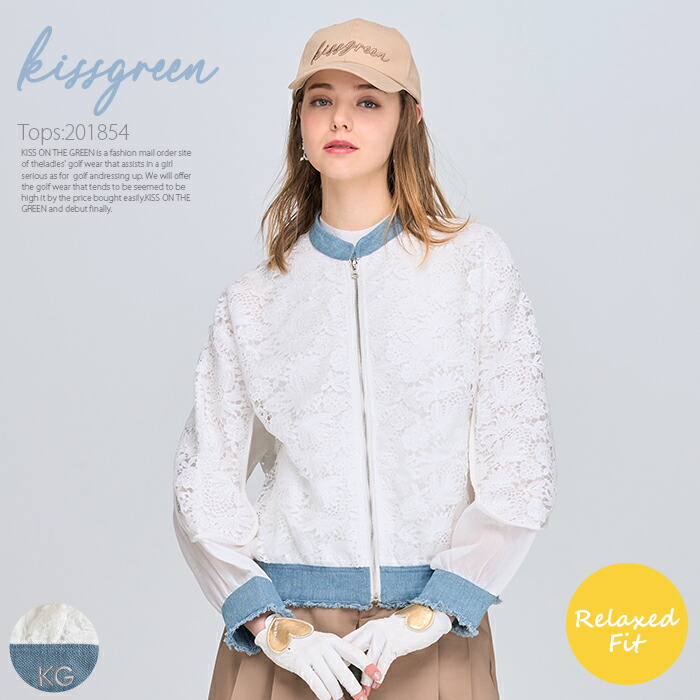 レースジップアップアウター / ゴルフウェア レディース 長袖 無地 レース デニム素材 カジュアル おしゃれ / リラックスフィット ゆったりサイズ オーバーサイズ 着心地 golf かわいい ゴルフウェア レディース