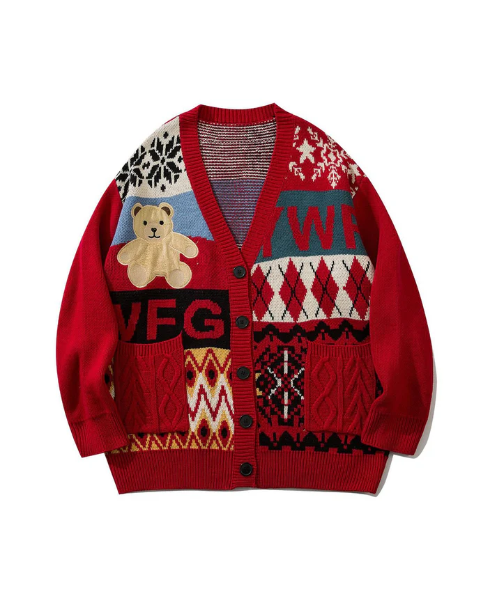 レトロな雰囲気漂う、パッチワーク風のベアモチーフが印象的なカーディガン。